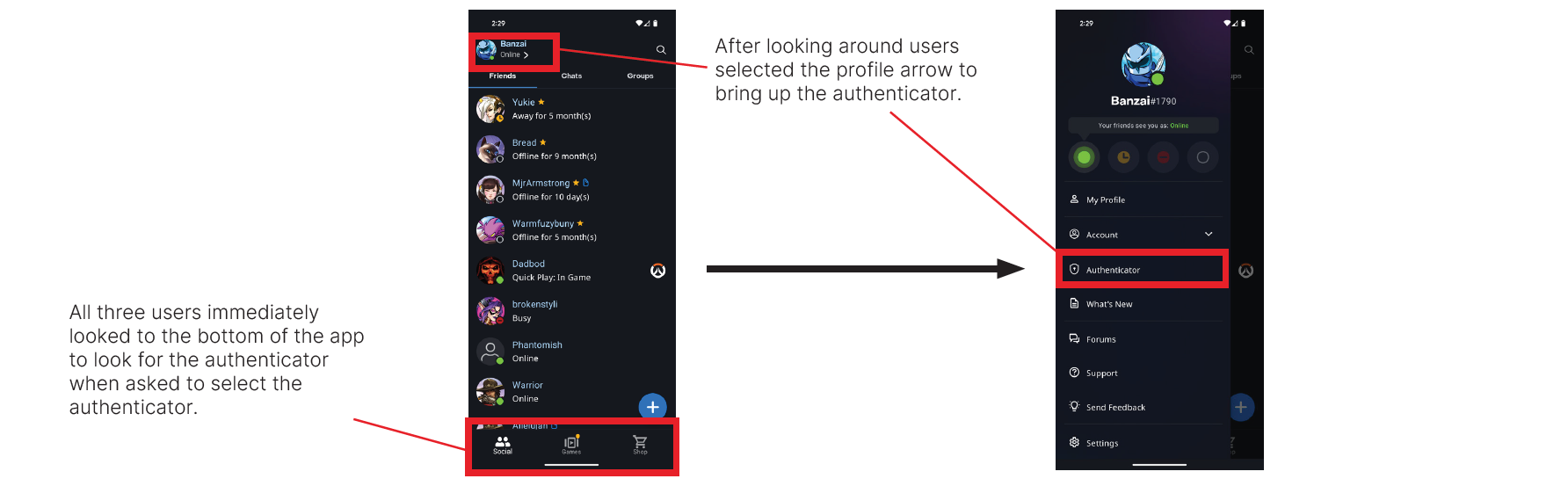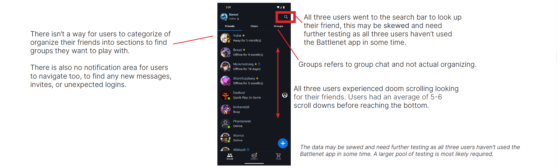 For the social usability problem, the platform lacks a notification center to alert users of suspicious activities, updates, promotions, events, and system statuses. While SMS notifications are currently used, integrating a notification within the app, with options to opt-in or out is currently missing to improve communication and security for users. It also falls short in friend management. Since Battle net is a social app, not having a way to organize or create those categories in mobile takes away an important feature of connectivity.