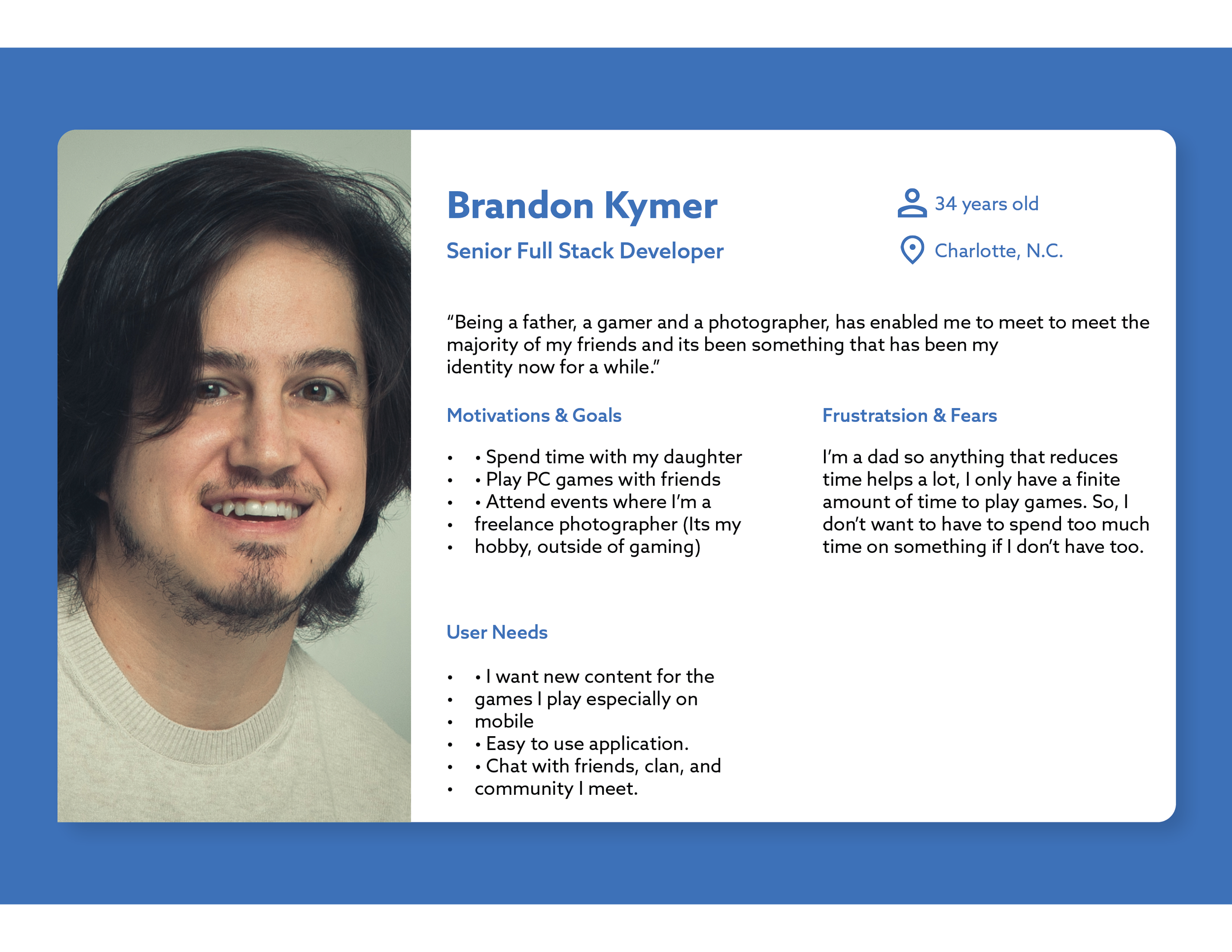 From my research, I developed 3 personas to represent the gaming users. These three users participated in the survey during the first weeks of research gathering and represented the user case. By focusing on users that were primarily gamers, it allowed me to acquire accurate data that leant into creating something that was tailored the user experience of gamers. The three users are my brother and two friends that I game with almost every day, and they were willingly to assist in the user research survey.
