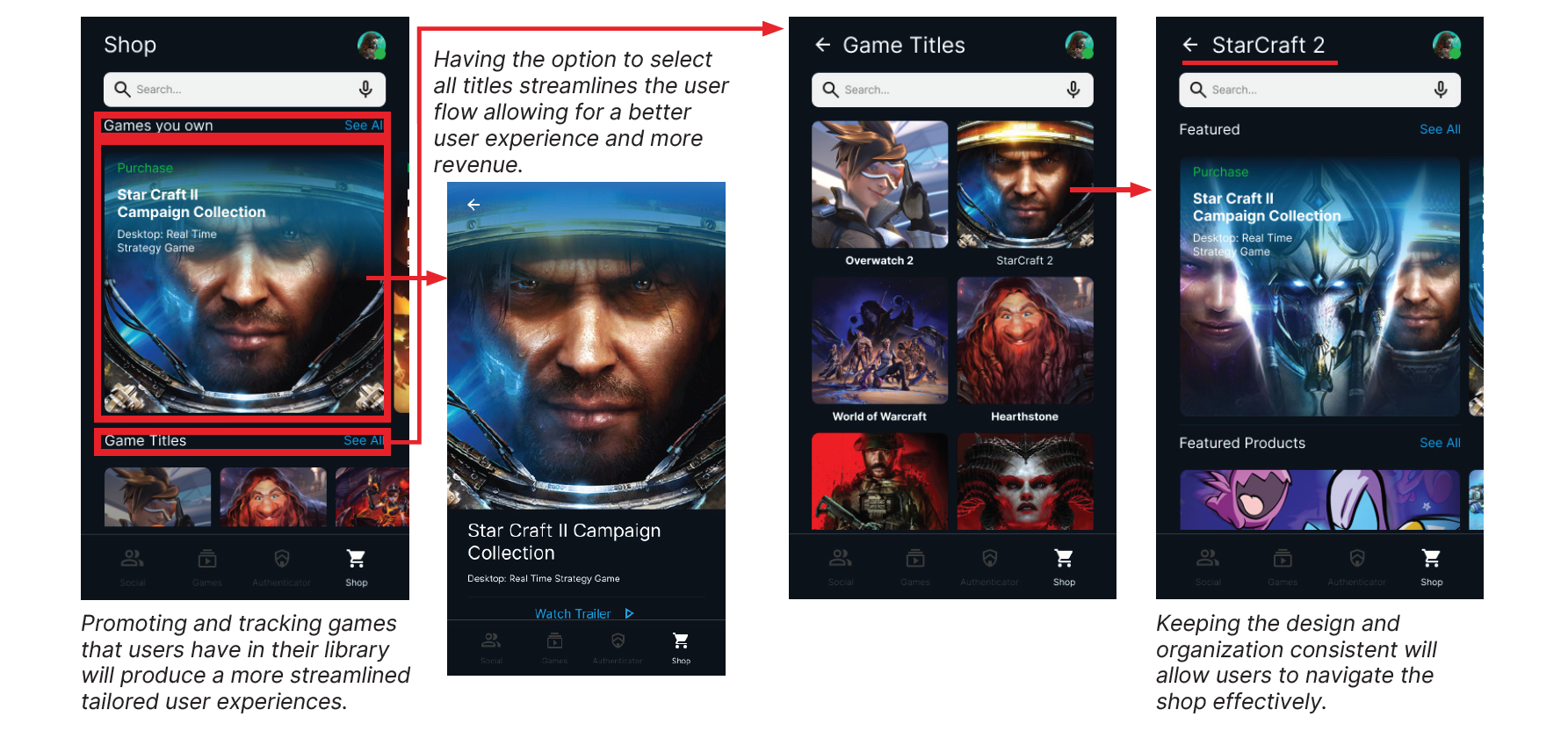 Use existing patterns to decrease cognitive load. I loved the unique challenge of designing for this existing mobile app and helping to enhance the wants and needs of gamers. I was truly humble and appreciative to redesign an application from a professional juggernaut like Blizzard Entertainment..