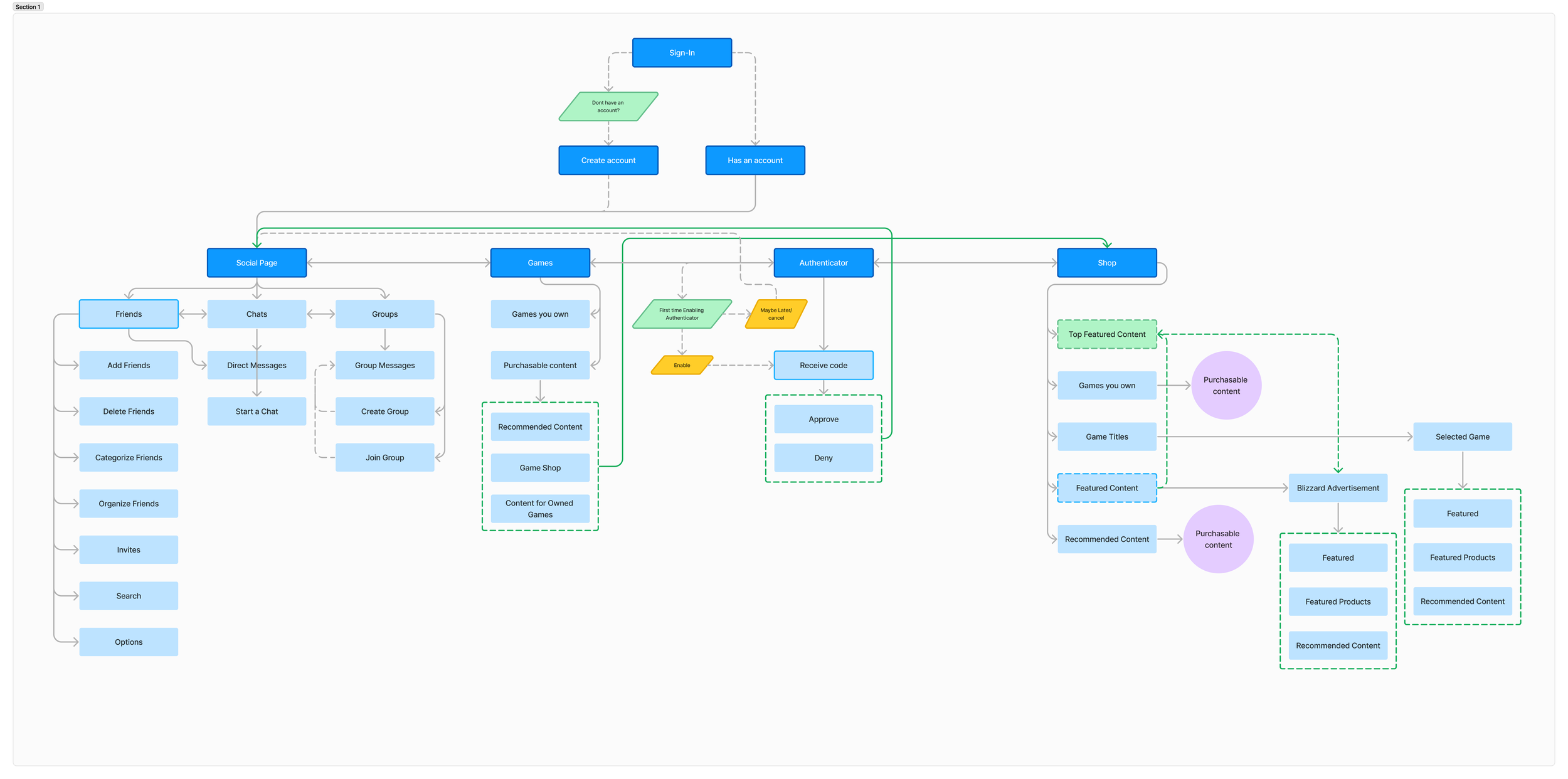 From the touch points and needs gleamed from the empathizing phase, I created a Product User Flow Map to outline specific application features and organize the user flow, to better align specific user pain points, needs and wants when tackling the mobile Battlenet feature updates.