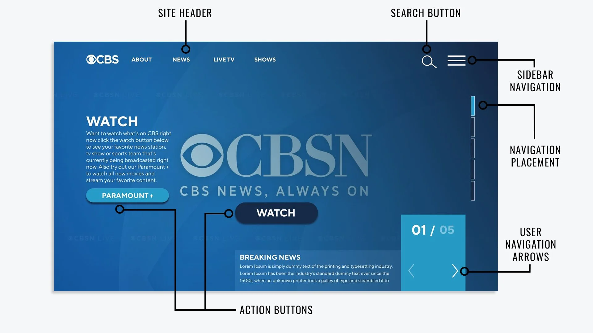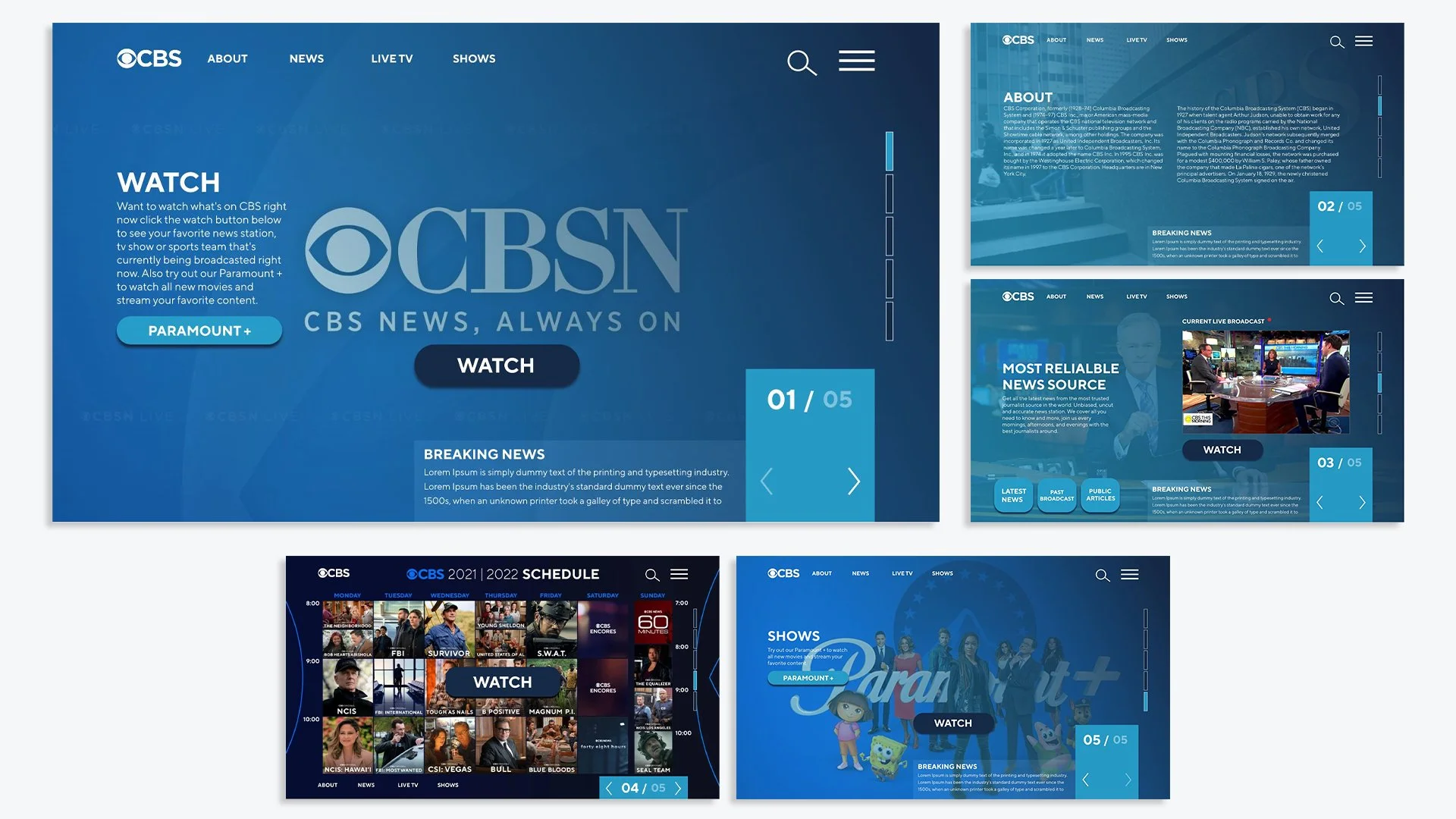 This project is a relaunch of the existing CBS platform, focusing on its online presence and the new and improved Paramount+ subscription service, which offers access to shows and live television. The goal is to represent CBS with a new minimalist, modern design that attracts more website traffic and increases subscriptions for Paramount+.